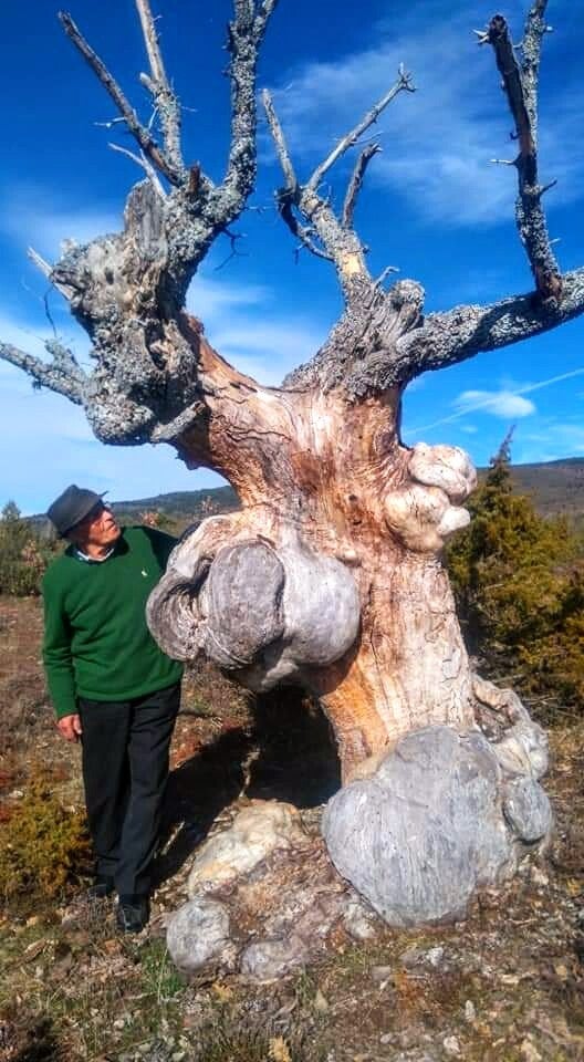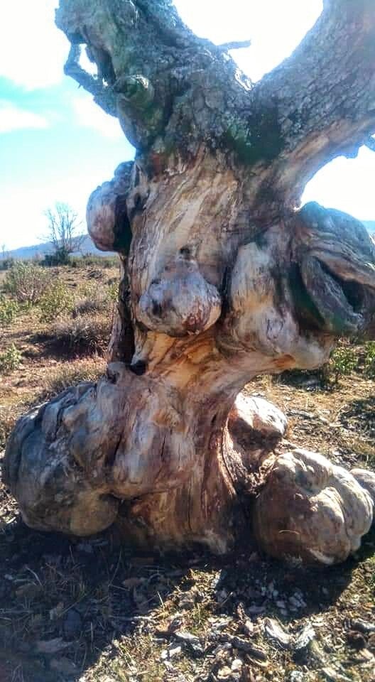 Este singular árbol de formas caprichosas, nodos y voluptuosas redondeces, marca una considerable diferencia con el resto de árboles del entorno.