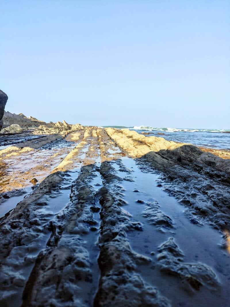 En Zumaia, en la Playa de Itzurun, la naturaleza nos deleita con un libro abierto en líneas horizontales y verticales, donde se escribieron las memorias de la tierra frente a la inmensidad del espíritu hecho mar. Allí, todo es tan relativo y revelante a la vez, que el entendimiento no alcanza la magnitud del sentimiento, entonces afloja la persecución de la perfección y aflora la confianza en el momento.
