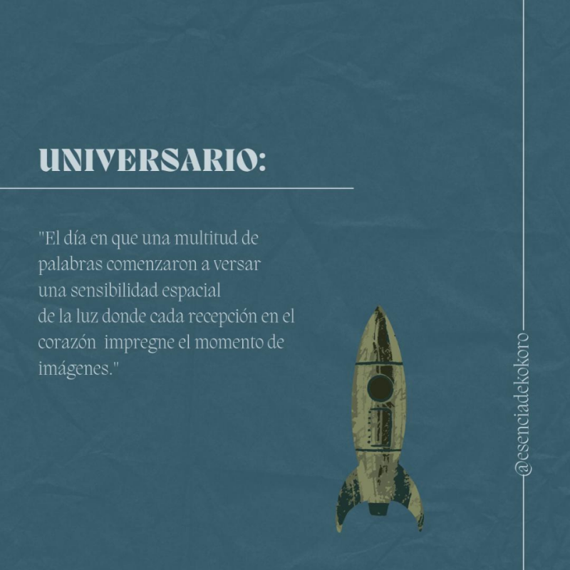 Universario consta de tres apartados, en cada uno se verán reflejadas las inquietudes que me llevaron a crear cada fragmento, aunque como dijo Eduardo Galeano :"Todos escribimos un solo libro, que va cambiando y se va multiplicando a medida que la vida vive y el escritor escribe." Y en esa magnitud cada lector comprende la esencia de su Kokoro. La búsqueda y encuentro de la comprensión es lo que nos mueve de forma conjunta, los caminos nunca son pisados por los mismos pies, ni el agua del río es la misma hasta que se hace océano. Espero que disfrutes de esta pequeña muestra de mi legado. El color de las imágenes se asemeja al de un negativo fotográfico del que cada Kokoro revelará su contenido.